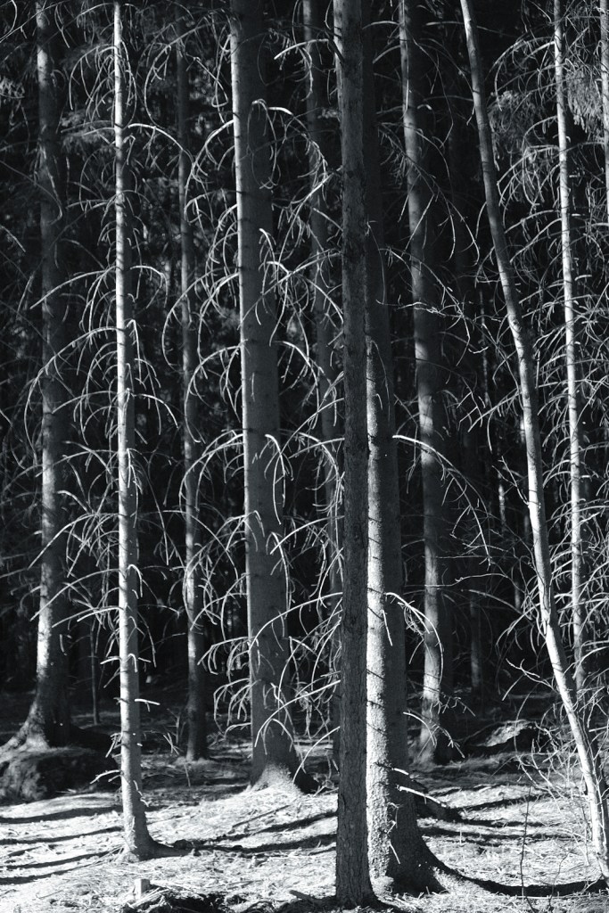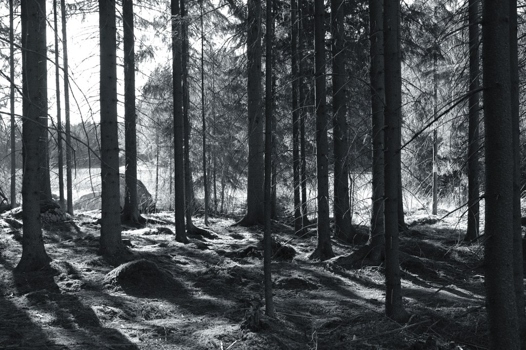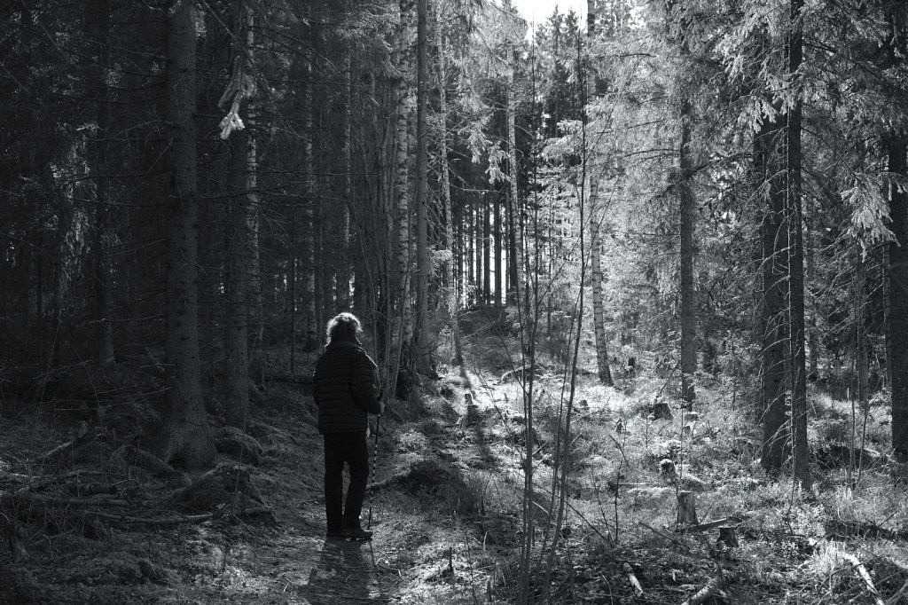 Ulkoilu lisääntynyt merkittävästi. Mustavalkokuvia metsälenkiltä.